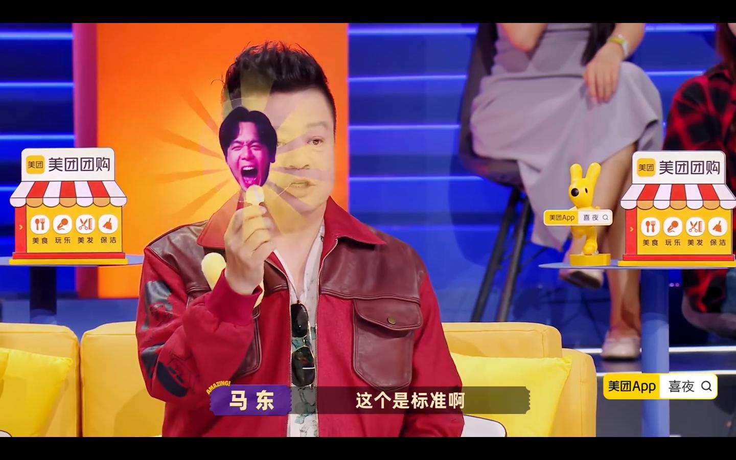 马东说这个扇子上的嘴型就是标准,就是领笑员张大嘴笑的标准,不然就不配叫“观众不代表”,关键是节目组还刻意做了一把带刻度的扇子,要求大家试一试嘴巴张的最大的极限!