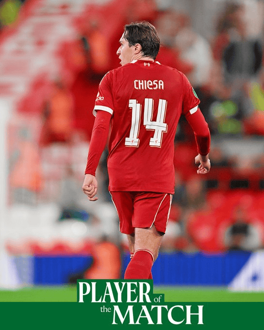 虎扑09月24日讯 在北京时间今天凌晨结束的联赛杯第3轮的比赛中,利物浦2-1战胜南安普顿。本场比赛,利物浦前锋基耶萨表现亮眼,成功当选队内评选的全场最佳球员。赛后,他也接受了利物浦电视台采访,谈到了自己对比赛看法和感受。